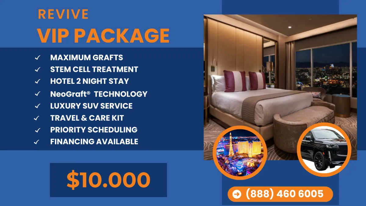 At Revive, procedures start at $2 per graft for NeoGraft® FUE. We also offer all-inclusive $10K VIP packages with maximum graft (no per-graft pricing limits).
